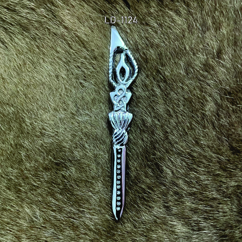 This elegant Celtic-style kilt pin features a polished silver-tone finish with intricate knotwork and a decorative spear-shaped design. The detailed knot at the center and the textured shaft add a traditional Highland touch, making it perfect for kilts, tartan outfits, and Scottish ceremonial wear. Durable, stylish, and crafted for secure fastening on any kilt.