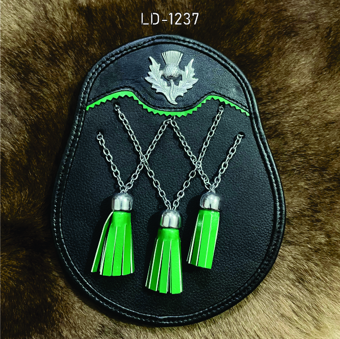 Add elegance and tradition to your Highland outfit with this Scottish black leather sporran, featuring a striking silver thistle mount and three vibrant green tassels. Crafted from premium leather, it combines durability with classic Scottish styling. The secure flap closure, spacious interior, and adjustable straps ensure comfort and practicality with any kilt. Perfect for weddings, formal Highland dress, ceilidhs, or Highland games, this sporran embodies authentic Scottish craftsmanship and timeless Celtic design.