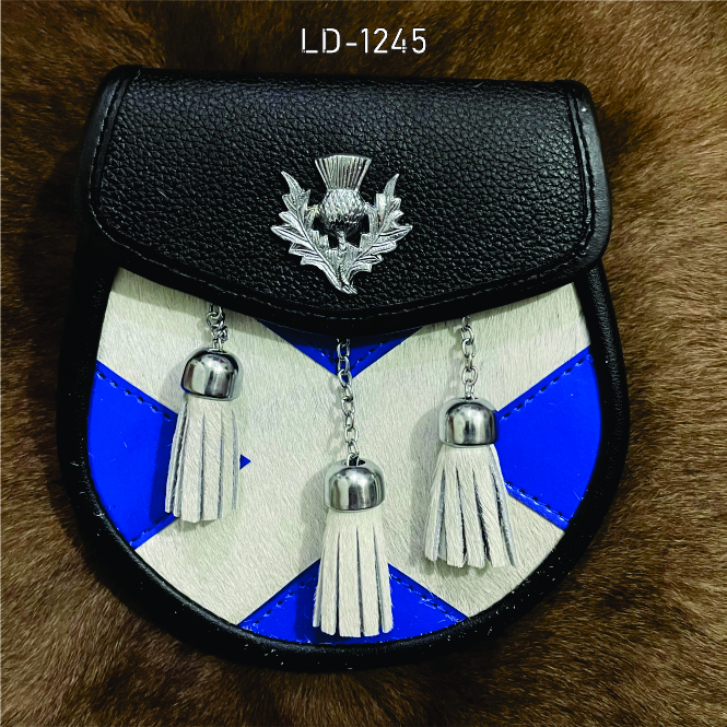 Show your Scottish pride with this bold Scottish flag sporran, featuring a vibrant tartan front or emblem inspired by the Saltire. Crafted with durable leather and high-quality materials, it includes a secure flap closure, adjustable straps, and spacious interior for practicality. Perfect for weddings, ceilidhs, Highland games, or casual kilt wear, this sporran combines authentic Scottish craftsmanship with patriotic style, making it an essential accessory for any kilt ensemble.